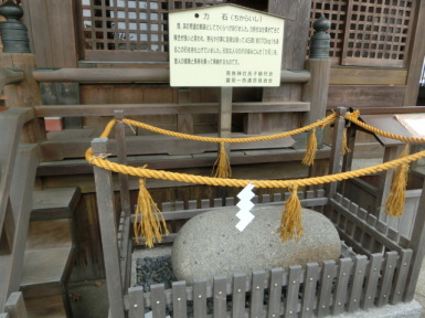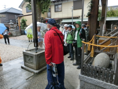 次は飛鳥神社です。ここでもガイドさんの説明です。境内には力石が置いてありました。