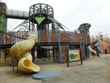 船舶がたくさんみえます。また埋め立て地には遊具やプールや