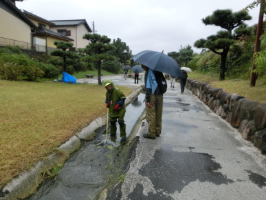 雨の中数人のボランティアの方が水路の清掃をされていました。