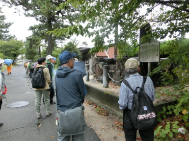 コンビニにより、すぐ近くの治水事業完成記念碑の前でボランティアガイドの